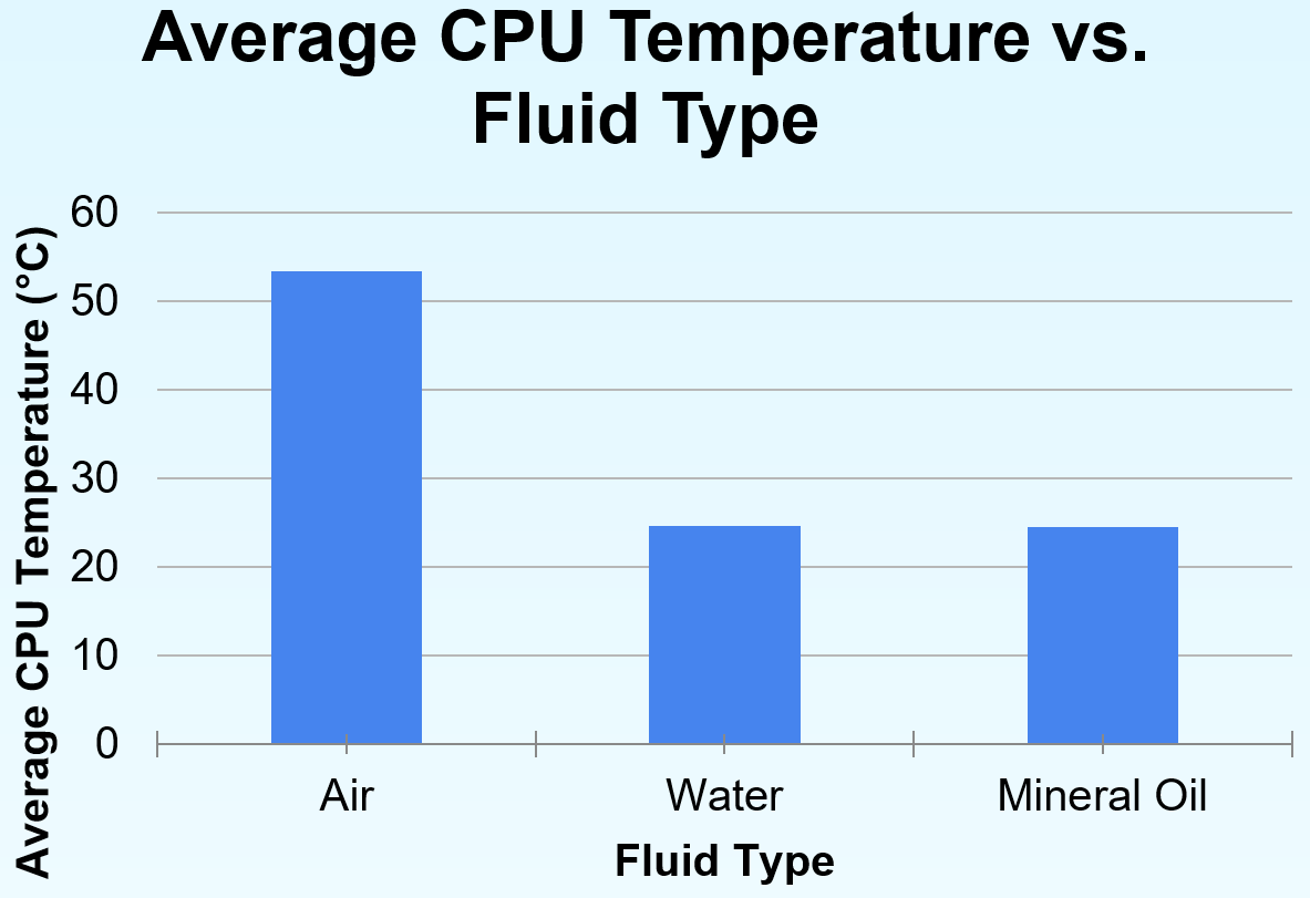 In addition to the above, a study was conducted to see how changing the fluid to water or mineral oil would affect the average CPU temperature.