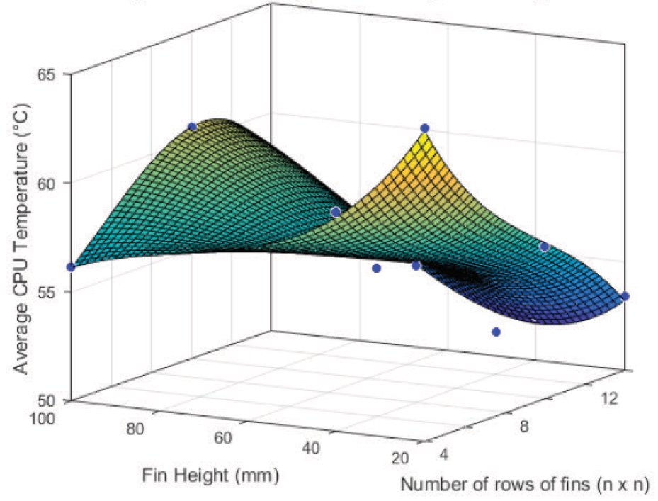 Having validated the model and determined the mesh size, parametric studies were conducted to see how the number of fins columns/rows and the fin height affected the average CPU temperature and the performance factor. The performance factor was chosen to equal the inverse of the heat sink material cost multiplied by the average CPU temperature. It was found that the average temperature increases with increasing fin height after a certain fin height. This was found to be because of the fact that the geometry interferes with the air flow after a certain point. As well, the number of rows/columns in the heat sink had an interesting downward trend for the average CPU temperature with an inflection point. After analyzing the streamlines in ANSYS, the infection point was found to be because of the air flow setup with the particular geometry. For the performance factor, it was found that the performance factor decreased with the fin height and the performance factor increased with increasing rows/columns in the heat sink.