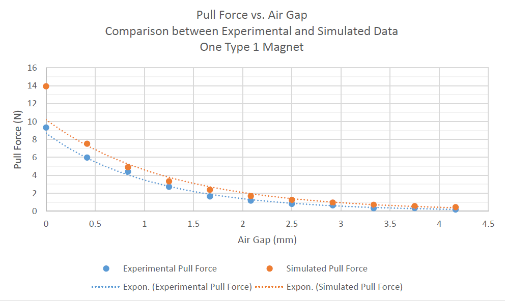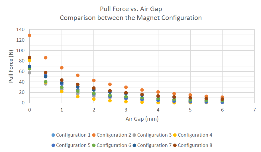 To determine the magnet configuration, the approach taken involved first determining how well ANSYS simulated the real world forces created my the magnets, and once the comparison had been done, various configurations were studied to find the optimal one for the car. This was done by first studying the force created between a neodymium magnet and the steel wall using a force gauge. A plot of force vs. distance was created and compared to an ANSYS simulation of a similar model. The distance in real life was varied using a screw and the distance was calculated using number of turns and pitch of the magnet. Having determined the relation between simulation and real life, the safety factors could be chosen to ensure that the magnets would work once designed in simulation. As such, a simulation was run for various magnet configurations and the one with the best results was chosen. A Halbach array configuration was also considered, but it surprisingly didn't perform as expected in simulation and the assembly would be difficult, so it was not selected.