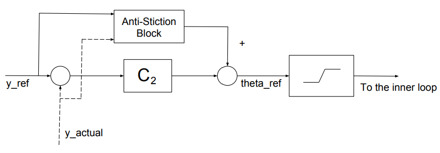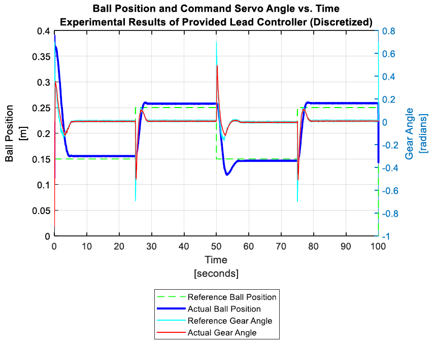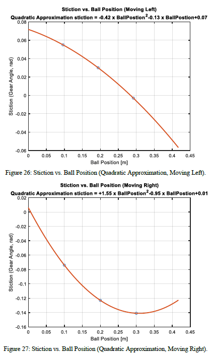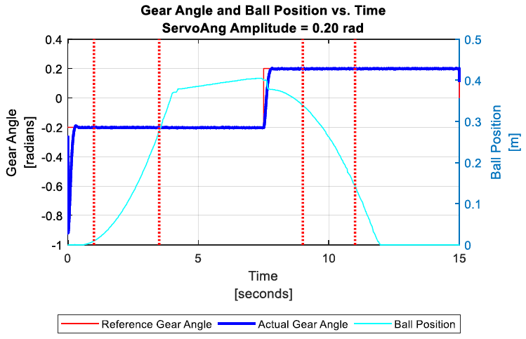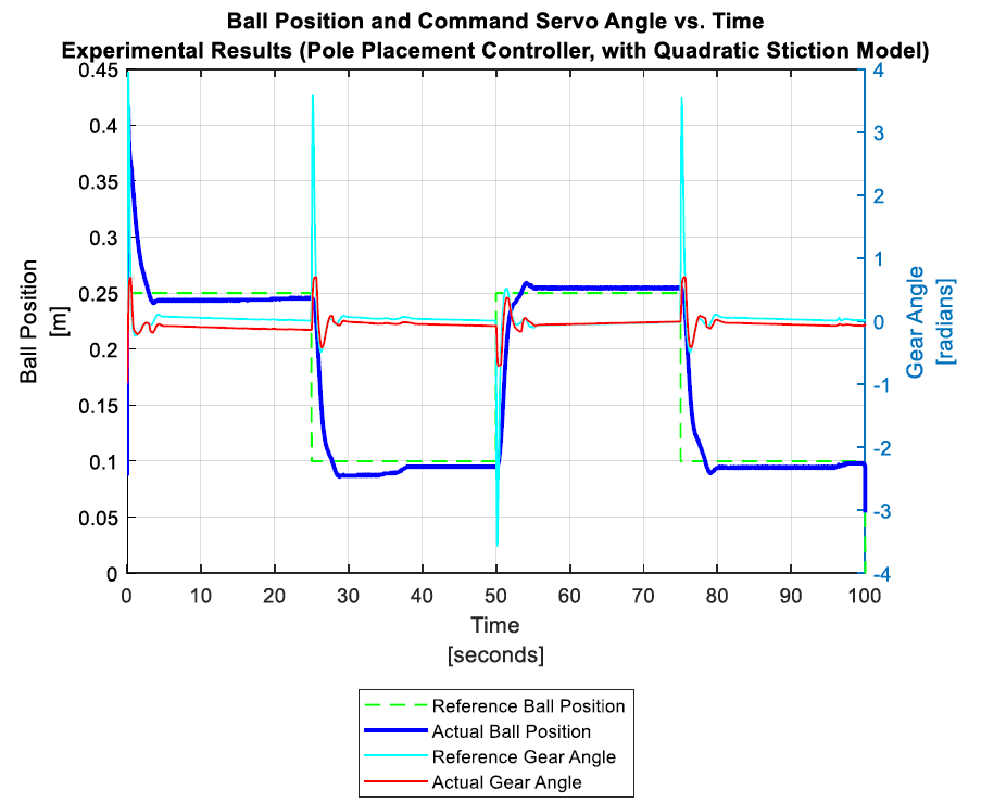 Finally, an outer-loop controller was implemented to control the ball position in the system. For the outer-loop controller, the inner-loop along with the actual plant all appear as the plant. First, a lead controller was implemented and analyzed both in simulation and in reality. This lead controller was provided by the course instructor as a starting point and it was found that the controller left a zero steady-state error. The steady-state error is not zero even though the plant has a sufficient number of integrators. This is because of non-linearities such as ball stiction in the system and the placement of these integrators. Having an integrator past all of the non-linearities in the plant is not as effective as an integrator at the beginning of the loop (ie. at the controller). This is because having an integrator at the controller level adjusts the output based on error between the reference and the output, while the integrator at the plant level is trying to adjust output based on error modified by the plant and its non-linearities. The mathematical closed loop system is able to stabilize because the Simulink model has linearized most of the non-linearities. Next, an outer-loop controller was designed using emulation design (pole placement). The same design method as outlined in "Inner-Loop Controller Design" was used. This outer-loop was tuned to meet certain specifications both in simulation and in reality. Lastly, ball-beam stiction that occurred when the gear angle was not large enough was modelled and accounted for. The anti-stiction block was designed by first determining at which gear angle the ball would start moving in the right and the left direction at various points on the beam. After collecting data at three points on the beam for the CW and CCW direction, a linear and quadratic fit was done on the collected data. This provided functions to counter act the stiction. After testing the two models, it was found that the quadratic model performed better than the latter and as such was used in the final design.