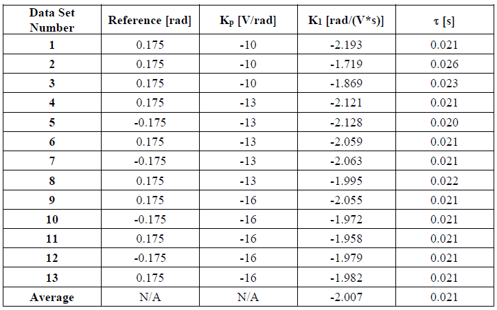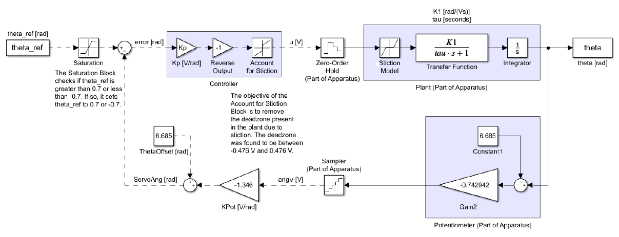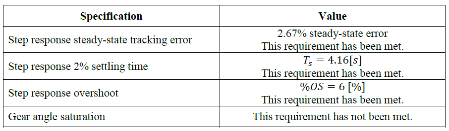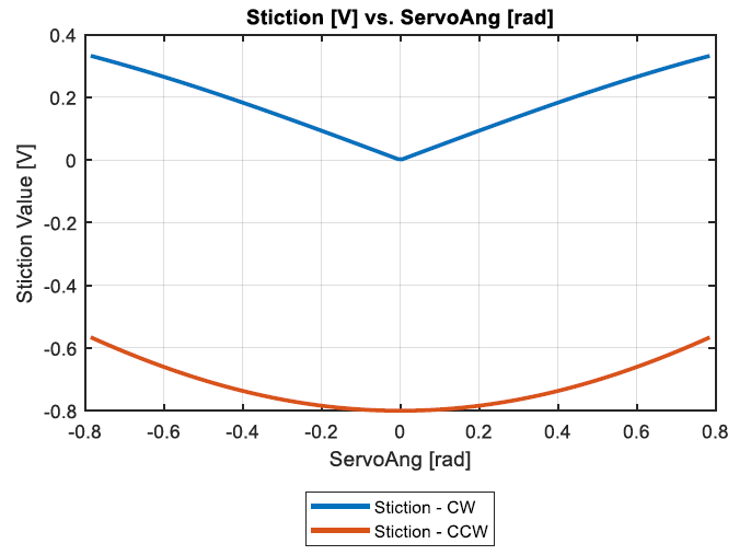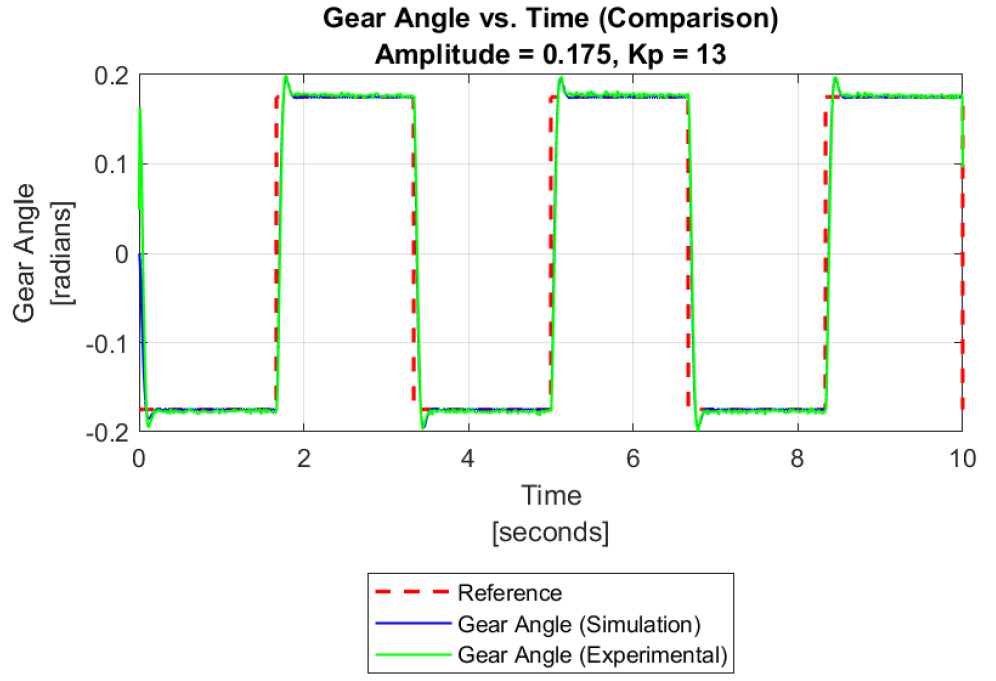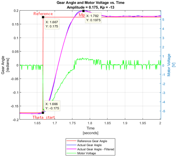 To begin, the motor system plant was stabilized, modeled, and validated. First, potentiometer voltage readings were converted to gear angle readings in radians by performing sensor scaling. This is an important step as it is important for a controller to be able to sense the variable it is controlling in the same units as the reference input. Additionally, the inverse of the sensor scaling provides a good start to create a model of the motor plant. To continue, static motor friction was accounted for and approximately cancelled out. This was done by first measuring the voltage required to barely get the motor moving under different scenarios. While this could have been crudely modeled by determining the two stiction values: one for CW movement, and one for CCW movement, Baraa and I decided to go one step further and create functions to define the stiction over the required range of +45 degrees to -45 degrees. In code, the stiction was accounted for by adding the additional voltage required to get the gear turning to the control signal. Having determined and modeled the former, the system model parameters were experimentally determined by analyzing the overshoot and time to first peak responses for the system under proportional controller. The overshoot and time to first peak analysis was done with various Kp gains to get accurate system parameters K1 and tau. Next, a saturator was implemented such that the gear angle output can only be within a certain safe operating range. This prevents the system from going into unwanted regions which could cause failure. Lastly, an overall block diagram was developed and analyzed.
