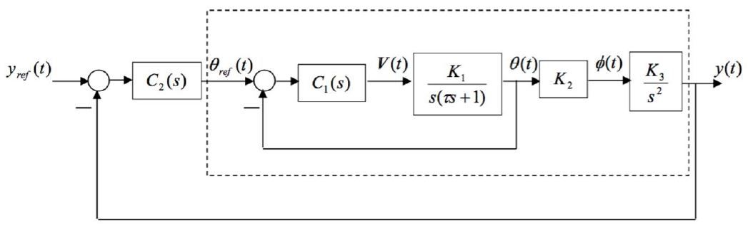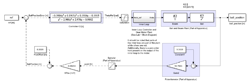 As part of our digital controls course, we were required to control a ball and beam apparatus moving the ball to follow a square wave. We were provided with overshoot, steady state error, settling time, and saturation requirements. We were also told to use the inner and outer loop control architecture taught in class. This allows the actuation layer, which is typically faster, to be tuned separately from the layer containing the variable of interest (in this case, this is the ball position). To prevent destruction of the apparatus, the plant was modeled in Simulink and