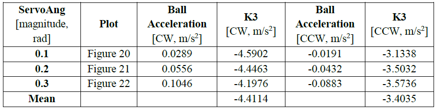 Having modeled and designed a controller for the motor system, it was time to divert our attention to the ball and beam system. The ball and beam system was modeled by finding a relation between the gear angle and the acceleration of the ball. The plant values K2 and K3 were found by looking at different angles (the acceleration should be the same in all cases) and taking the average of the 3 cases observed. It was found that K3 differed for the CW and the CCW direction.
