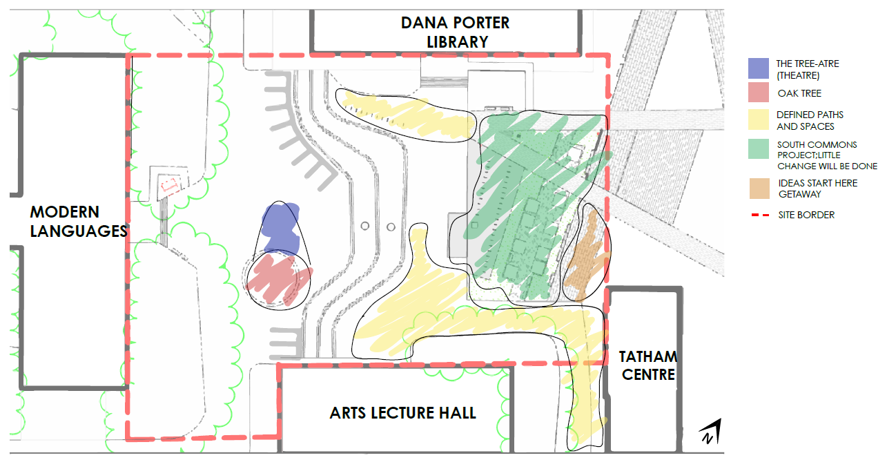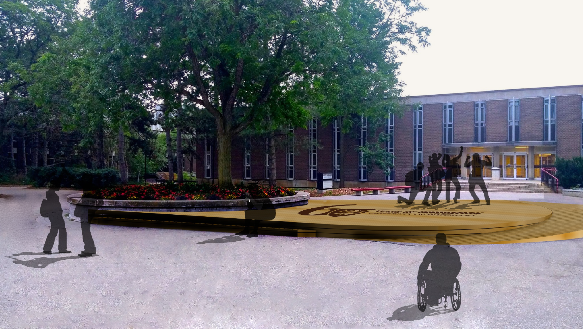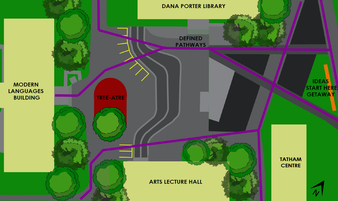 "Treeatre" - One of the prominent features on the Arts Quad is the old oak tree. Many of the students found this tree to be aesthetically displeasing, especially in the colder months when it stands bare. In order to draw students towards the tree, it is proposed a wooden stage be built to provide students an area where they can program their events. As such speakers and lighting would be built in as well.