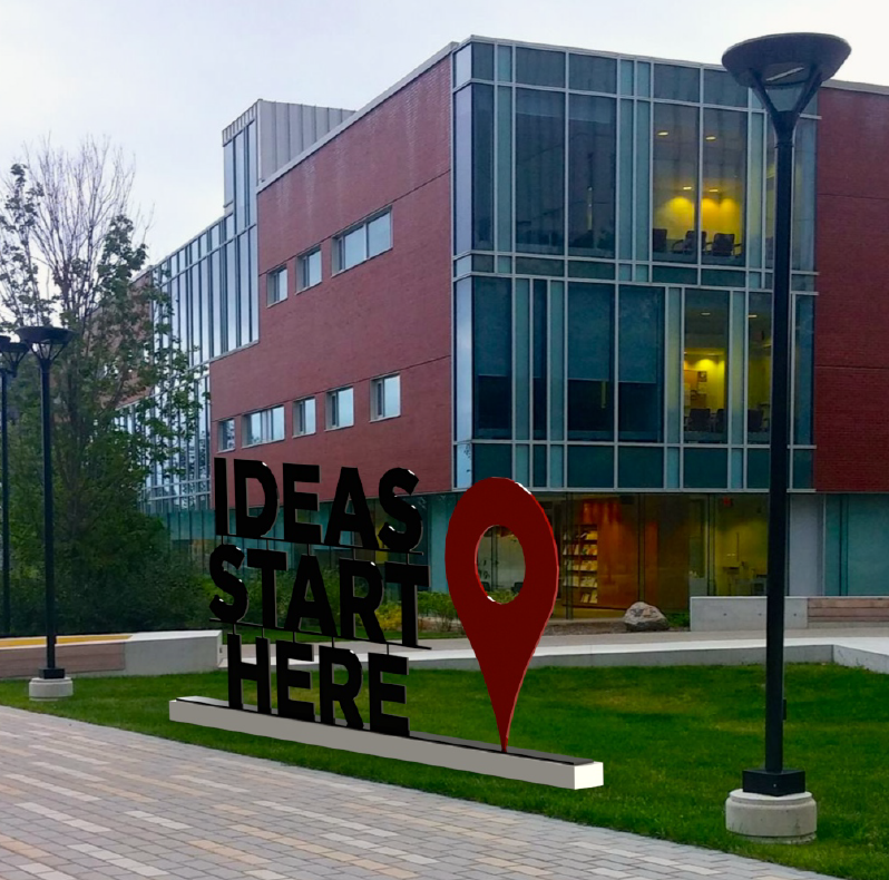 "Ideas Start Here" gateway - Introduce this sign as a reflection of the i3 entrance gateway sign which would be used to welcome people to the Arts Quad. This would attract people to the area, which it is currently lacking and also presents the area as one in which they can freely express themselves. We presented 2 separate, but similar concepts.