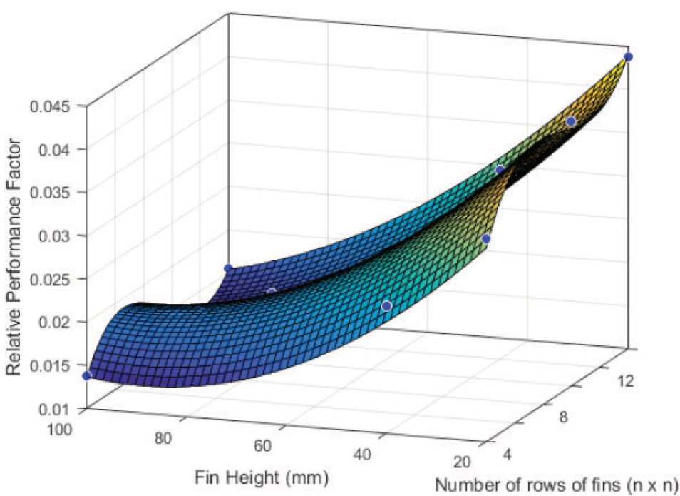 Having validated the model and determined the mesh size, parametric studies were conducted to see how the number of fins columns/rows and the fin height affected the average CPU temperature and the performance factor. The performance factor was chosen to equal the inverse of the heat sink material cost multiplied by the average CPU temperature. It was found that the average temperature increases with increasing fin height after a certain fin height. This was found to be because of the fact that the geometry interferes with the air flow after a certain point. As well, the number of rows/columns in the heat sink had an interesting downward trend for the average CPU temperature with an inflection point. After analyzing the streamlines in ANSYS, the infection point was found to be because of the air flow setup with the particular geometry. For the performance factor, it was found that the performance factor decreased with the fin height and the performance factor increased with increasing rows/columns in the heat sink.