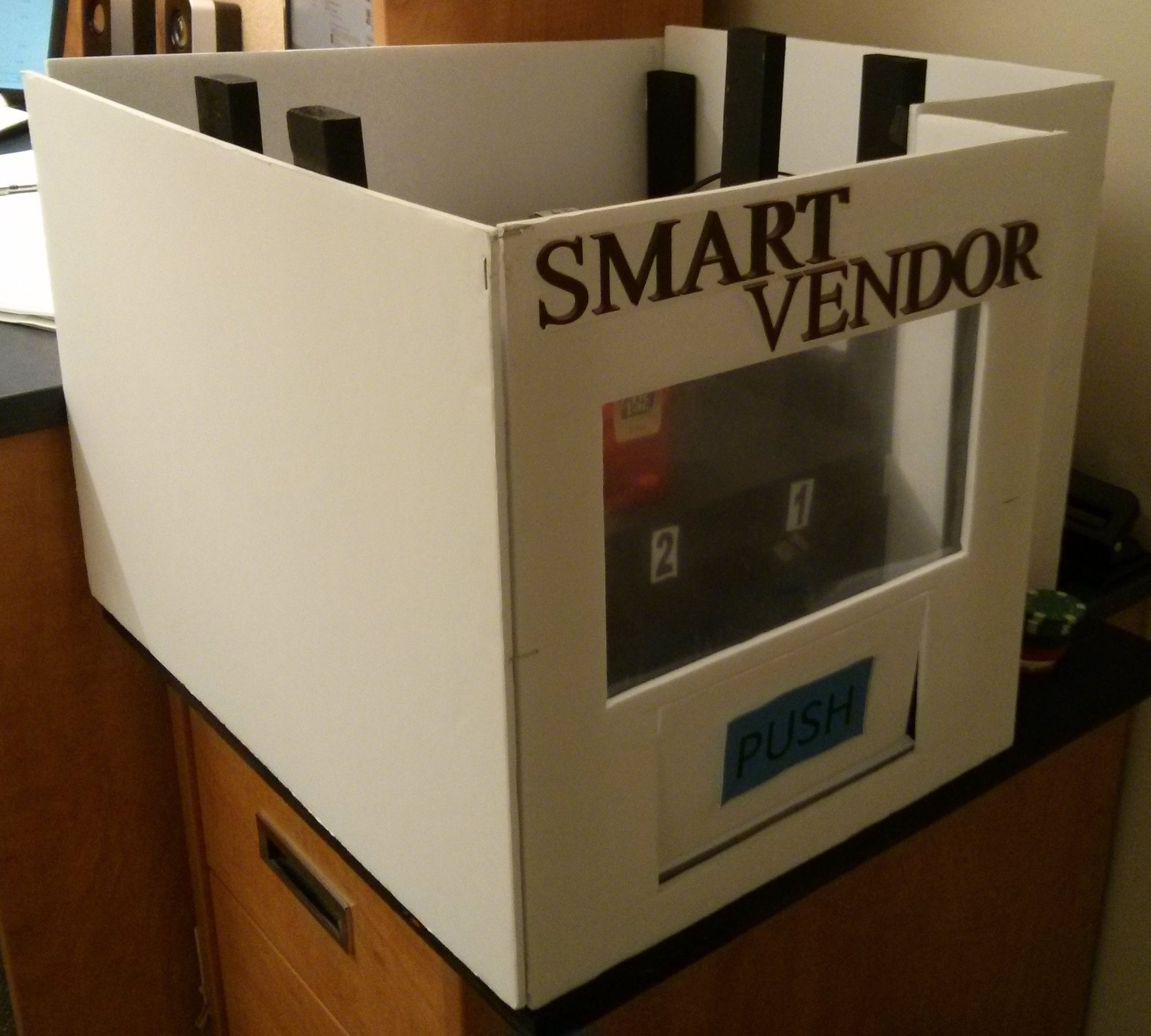 My group and I decided to build a smart vending machine, which would be able to sense its environment using an ultrasonic sensor. Using the information from the ultrasonic sensor, the vending machine would determine if there were people around, allowing it to turn on/off based on surrounding traffic. Based on our preliminary research, we found that awareness was a feature missing from vending machines at the time, meaning that they would have to stay on 24/7 to maximize chances of sales, which are primarily made by attracting customers through product staging and seeming operational. A 24/7 operation time for a vending machine seems unnecessary and is likely to waste quite a bit of energy, as such we decided to pursue this project. Also, it seemed to meed the project constraints.
