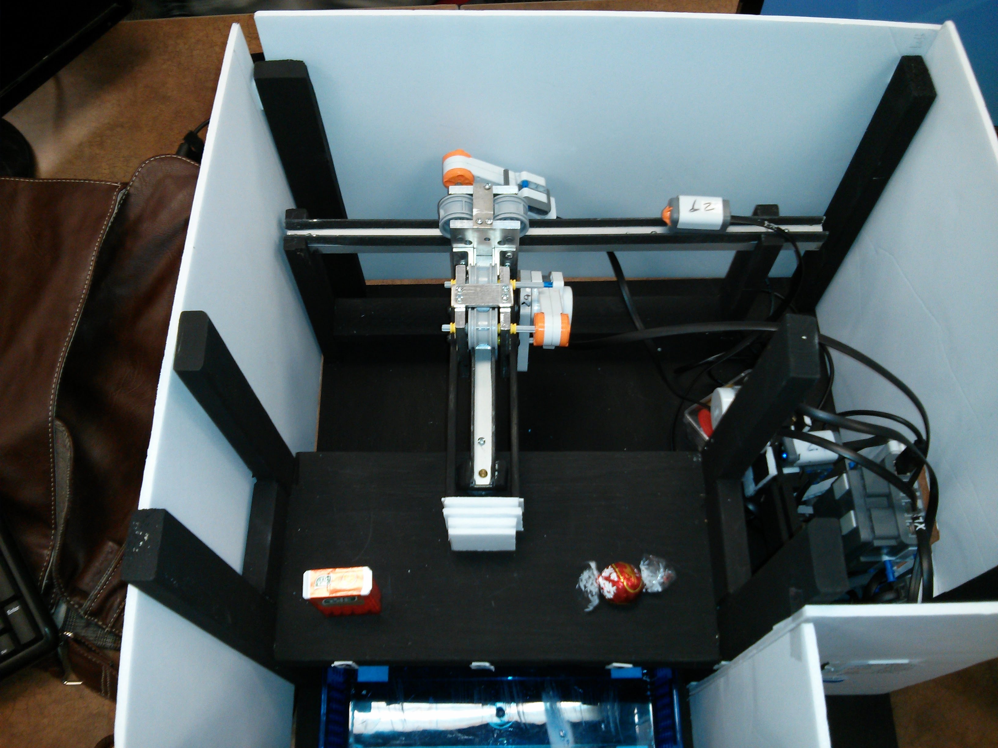 During our first semester at university, we were given an open ended project to be completed in groups of 4 in which we had to design a mechatronic system of our choice. There were a few constraints such as the design must use Lego Mindstorms NXT, three motors, three different type of sensors, etc.