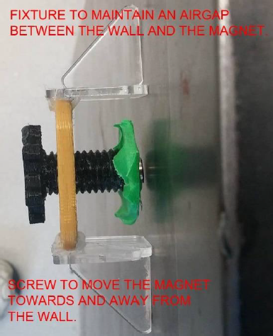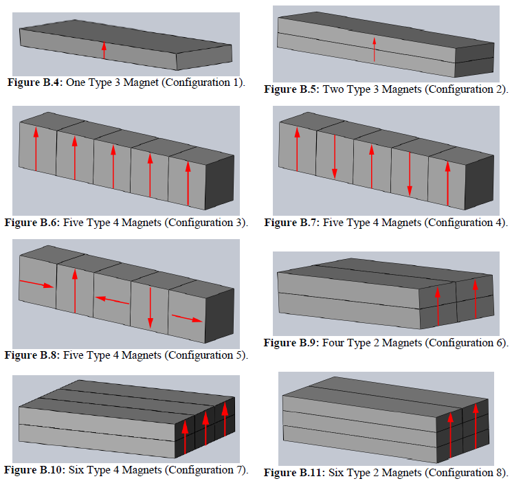 To determine the magnet configuration, the approach taken involved first determining how well ANSYS simulated the real world forces created my the magnets, and once the comparison had been done, various configurations were studied to find the optimal one for the car. This was done by first studying the force created between a neodymium magnet and the steel wall using a force gauge. A plot of force vs. distance was created and compared to an ANSYS simulation of a similar model. The distance in real life was varied using a screw and the distance was calculated using number of turns and pitch of the magnet. Having determined the relation between simulation and real life, the safety factors could be chosen to ensure that the magnets would work once designed in simulation. As such, a simulation was run for various magnet configurations and the one with the best results was chosen. A Halbach array configuration was also considered, but it surprisingly didn't perform as expected in simulation and the assembly would be difficult, so it was not selected.